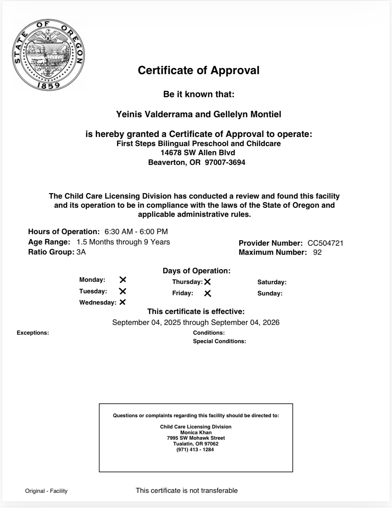 First Steps Bilingual Pre-School Child Care is a licensed preschool in Beaverton, OR, that offers child care services. We have been committed to helping children from infancy, toddlerhood, and preschool age socialize and develop personal discipline to help them in their future activities for 7 years. When you drop your child off at First Steps Bilingual Pre-School Child Care, you will drop them off at a place where they will go through fun and creative activities. Your child will develop a fundamental, enduring love of learning and attain the profoundly ingrained social, emotional, and academic skills they need to thrive as adults.